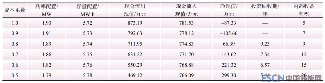 表8 不同成本系數(shù)下儲能投資經(jīng)濟性分析
