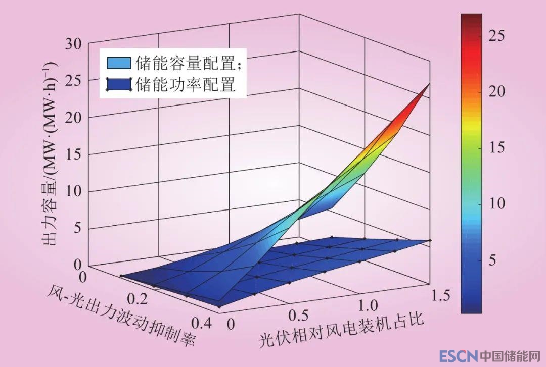為了更直觀地表示不同風光裝機比例對于儲能配置的影響,基于表7繪制不同光伏風電裝機容量比例下儲能配置需求圖,如圖6所示。