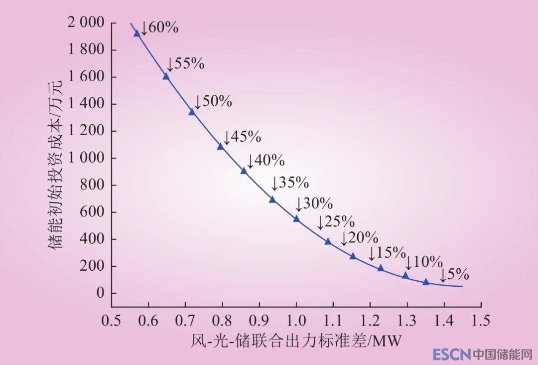 投資成本是儲能規(guī)劃設計的一項重要經(jīng)濟性指標,基于技術、經(jīng)濟性優(yōu)化結果可得到儲能系統(tǒng)投資成本與風-光-儲聯(lián)合出力標準差之間的帕累托曲線,如圖5所示。隨著風光出力波動抑制率的不斷提高,儲能的初始投資成本不斷提高,且提高速率逐漸增加。風光出力波動抑制率從5%提升到35%,儲能的初始投資成本僅增加658.61萬,而從35%提升到60%,儲能的初始投資成本增加1 213.02萬元,為滿足更高的風光出力的技術性要求需要投入的儲能成本將顯著提升。
