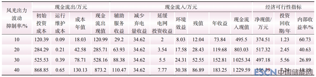 表4 不同風光出力波動抑制率下儲能系統(tǒng)配置方案