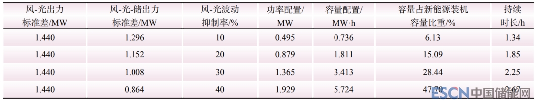 隨著風光出力波動抑制率要求的提高,儲能的功率、容量配置以及持續(xù)時長將快速增長。將風光出力的標準差降低10%最少需要配置0.495 MW/0.736 MW·h的儲能,儲能占新能源裝機容量占比僅為6.13%,持續(xù)時間為1.34 h;而將風光出力的標準差降低40%,則至少需要配置1.929 MW/5.724 MW·h的儲能,儲能占新能源裝機容量占比將提升到47.7%,持續(xù)時間需要提升到2.67 h。