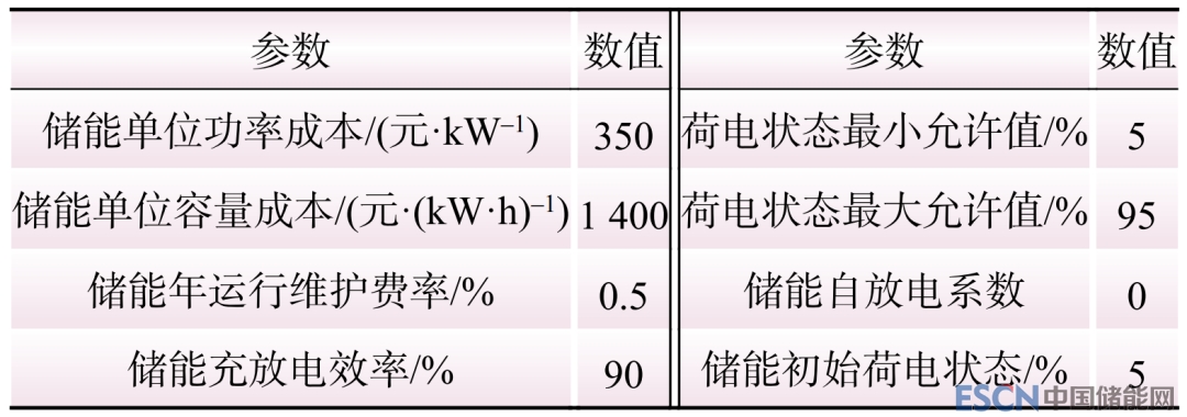 基于該地區(qū)的實際特點,擬在節(jié)點A處配置鋰離子儲能系統(tǒng),主要為新能源發(fā)電端提供輔助服務,因此該儲能系統(tǒng)對于發(fā)電端的影響為內(nèi)部價值,對于電網(wǎng)、用戶及環(huán)境的影響為外部價值。該儲能系統(tǒng)壽命為10年,容量衰減系數(shù)定為常數(shù)1,期末回收殘值率為10%。儲能的成本及效益計算采用凈年值計算方式,貼現(xiàn)率為8%。根據(jù)《華北電力調峰輔助服務市場運營規(guī)則》,儲能系統(tǒng)提供輔助服務的成本為0.4元/(kW·h)。儲能系統(tǒng)的其他參數(shù)設置如表3所示。