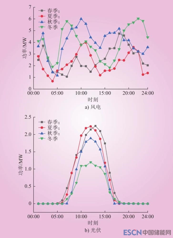 該地區(qū)的新能源由裝機容量為10 MW的風電站和2.5 MW的光伏發(fā)電站構成,能統(tǒng)一接入節(jié)點A。以季節(jié)變化為周期,該地區(qū)風、光的典型日出力曲線如圖3所示。根據(jù)國家《國家發(fā)展改革委關于2021年新能源上網(wǎng)電價政策有關事項的通知》,蒙西地區(qū)風電、光伏的上網(wǎng)電價為0.278 5元/(kW·h)。