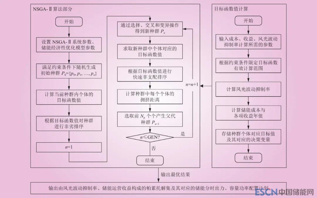 儲能技術經(jīng)濟性優(yōu)化模型為多目標優(yōu)化問題,基于加權法和目標規(guī)劃算法的傳統(tǒng)數(shù)學優(yōu)化方法帶有一定的主觀性,無法有效求得多目標算法的帕累托最優(yōu)解集合。NSGA-Ⅱ是目前求解大規(guī)模多目標優(yōu)化模型的有效算法,具有計算速度快、求解精度高、解集收斂性好、可求得帕累托最優(yōu)解集等特點[27]?;诖耍疚牟捎肗SGA-Ⅱ算法對儲能技術經(jīng)濟性優(yōu)化模型進行求解,算法流程圖如圖2所示。