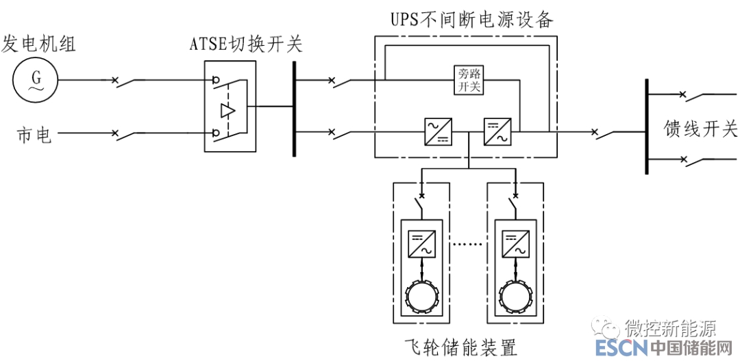 當(dāng)市電中斷或故障時(shí),飛輪儲(chǔ)能型UPS可實(shí)現(xiàn)毫秒級切換為重要負(fù)荷提供不間斷電源保障,同時(shí)ATSE自動(dòng)切換至柴油發(fā)電機(jī)組供電;