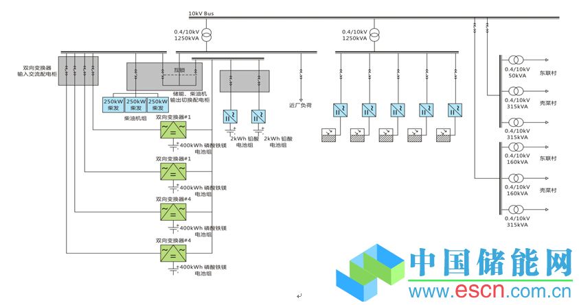 柴油發(fā)電機組由2臺250kW和1臺500kW的柴油發(fā)電機組成。4臺250kVA雙向變換器構(gòu)成微網(wǎng)主干網(wǎng),其中兩臺雙向變換器分別配備400kWh磷酸鐵鋰電池,另兩臺分別配備900kWh鉛酸電池。為保證系統(tǒng)儲能容量另配置2臺250kW的儲能變流器,每臺儲能變流器配備2MWh鉛酸電池,此微電網(wǎng)系統(tǒng)總存儲能量可達6.6MWh。