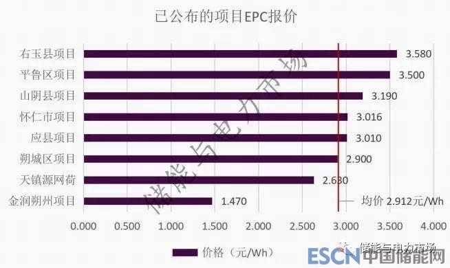 在上述的19個(gè)項(xiàng)目中已有8個(gè)項(xiàng)目的EPC投標(biāo)報(bào)價(jià)進(jìn)行了公布,報(bào)價(jià)區(qū)間為1.47~3.58元/Wh,均價(jià)為2.912元/Wh。其中大多數(shù)的項(xiàng)目價(jià)格在3元/Wh左右,遠(yuǎn)遠(yuǎn)高于其他地區(qū)的儲(chǔ)能項(xiàng)目EPC中標(biāo)價(jià)。據(jù)了解,這或與項(xiàng)目配置重卡換電系統(tǒng)有關(guān)。
