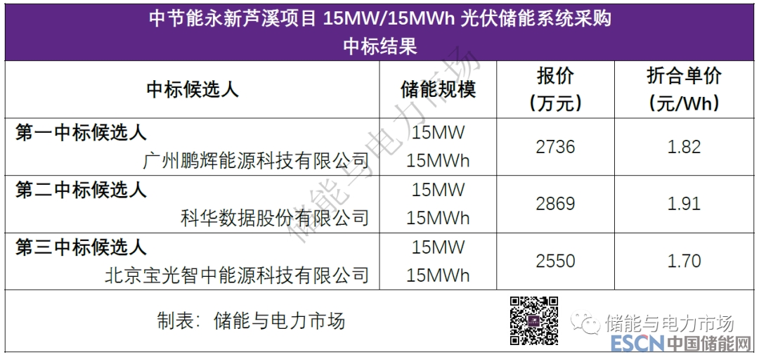 中國儲能網(wǎng)訊:近日中節(jié)能永新蘆溪項目15MW/15MWh光伏儲能系統(tǒng)采購發(fā)布中標(biāo)候選人公示。廣州鵬輝能源科技有限公司以總報價2736萬元,折合單價1.82元/Wh,成為第一中標(biāo)候選人。