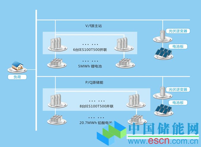 在無電地區(qū)(孤島系統(tǒng))中,通過IES100雙向儲能變流器合理分配,雙向儲能變流器分別作為微電網(wǎng)發(fā)電系統(tǒng)中的電壓源(V/f源模式)和電流源(P/Q模式),在吸收電網(wǎng)波動的同時為電網(wǎng)提供穩(wěn)定的電壓和頻率,調(diào)節(jié)發(fā)電和用電間的平衡來實(shí)現(xiàn)純離網(wǎng)系統(tǒng)的穩(wěn)定運(yùn)行。