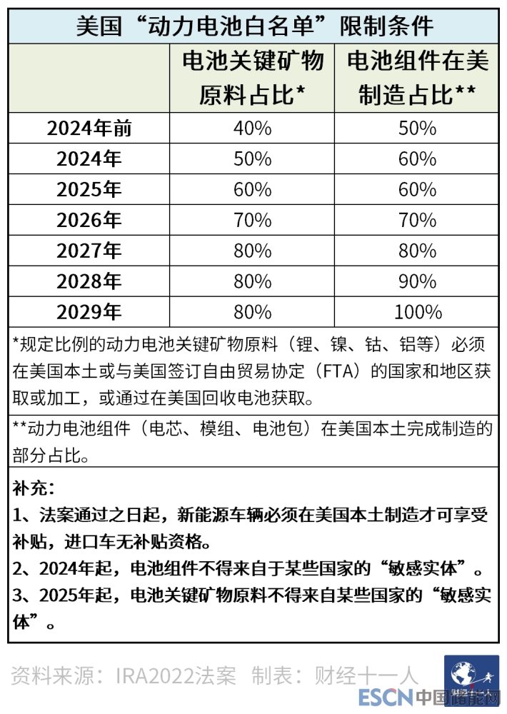 該法案中對中國企業(yè)影響最大的是對清潔能源汽車補貼設置了動力電池限制條款,該條款與中國在2015年-2019年執(zhí)行的《汽車動力蓄電池行業(yè)規(guī)范條件》,即“動力電池白名單”頗為相似,因此也被稱為美國版“動力電池白名單”。
