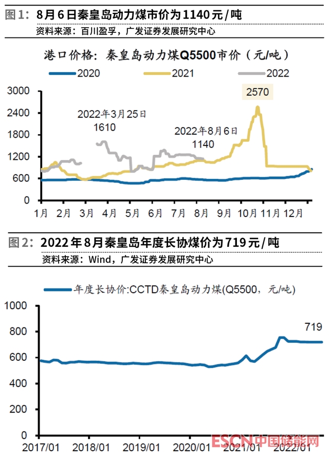 另一方面,國務(wù)院出臺多項措施保障煤炭供應(yīng),原煤產(chǎn)量持續(xù)提升,2022年至今原煤單月產(chǎn)量均實現(xiàn)超10%以上的同比增速。價格方面,2022年8月6日秦皇島5500大卡動力煤市場價為1140元/噸,較3月高點已下降470元/噸;8月秦皇島5500大卡動力煤年度長協(xié)煤價為719元/噸,環(huán)比繼續(xù)持平。