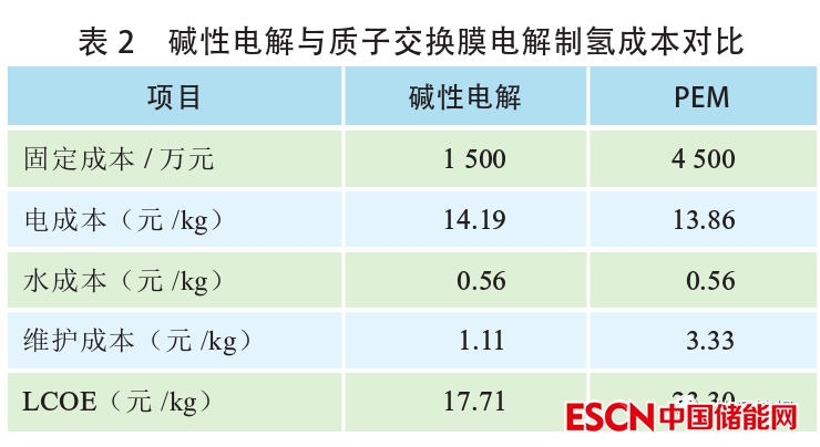 以堿性電解和PEM電解項(xiàng)目(1000Nm3/h)為例,假設(shè)項(xiàng)目全生命周期為20年,運(yùn)行壽命9萬h,固定成本包裹電解槽、氫氣純化裝置、材料費(fèi)、土建費(fèi)、安裝服務(wù)費(fèi)等項(xiàng)目,電解以0.3元/kWh計(jì)算,成本對比見表2。
