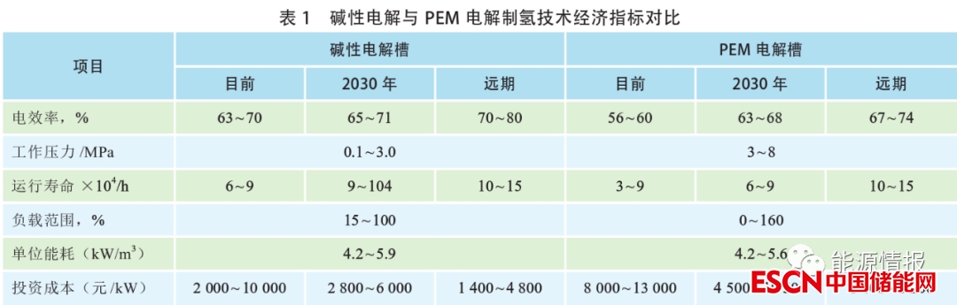 我國以可再生能源(如風(fēng)電、光伏、水電)進(jìn)行電解水制氫,電價(jià)控制在0.25元/kWh以下時(shí),制氫成本具有相對經(jīng)濟(jì)性(15.3~20.9元/kg)。堿性電解與PEM電解制氫技術(shù)經(jīng)濟(jì)指標(biāo)見表1。