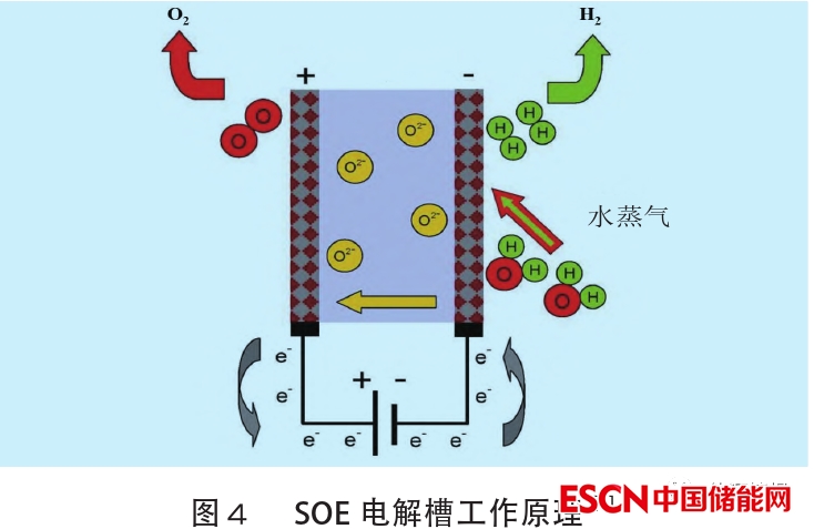 固體氧化物電解槽(SOE)利用高溫水蒸氣(600~900℃)電解,效率高于堿性電解槽和PEM電解槽。20世紀(jì)60年代,美國和德國就開始進(jìn)行SOE高溫水蒸氣的相關(guān)研究。SOE電解槽的工作原理如圖4所示。循環(huán)氫氣和水蒸氣從陽極進(jìn)入反應(yīng)系統(tǒng),水蒸氣在陰極電解成氫氣,陰極產(chǎn)生的O2–通過固體電解質(zhì)移動到陽極,重新結(jié)合形成氧氣并釋放電子。