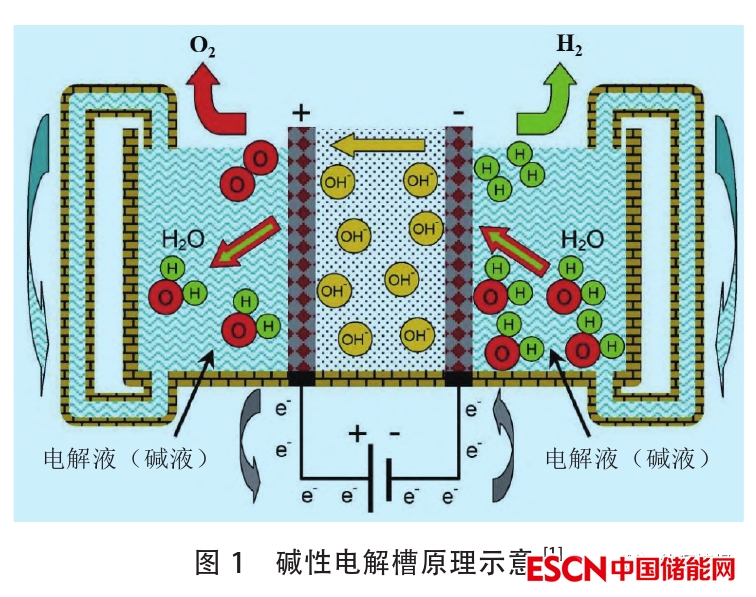 堿性電解槽的工作原理如圖1所示。電池由兩個(gè)電極組成,兩個(gè)電極由氣密隔膜分開。電池裝配時(shí)浸沒在高濃度的堿性液體電解質(zhì)KOH(20%~30%)中,使離子電導(dǎo)率最大化,NaOH和NaCl溶液也可作電解液,但不常用,電解液的主要缺點(diǎn)是具有腐蝕性。電解槽的工作溫度為65~100℃,電解槽陰極產(chǎn)生氫氣,生成的OH–通過隔膜流向陽極,在陽極表面重新結(jié)合產(chǎn)生氧氣。先進(jìn)的堿性電解槽適合大規(guī)模制氫,一些制造商制造的堿性電解槽在(500~760Nm3/h)具有非常高的產(chǎn)氫能力,相應(yīng)的耗電量為2150~3534kW。