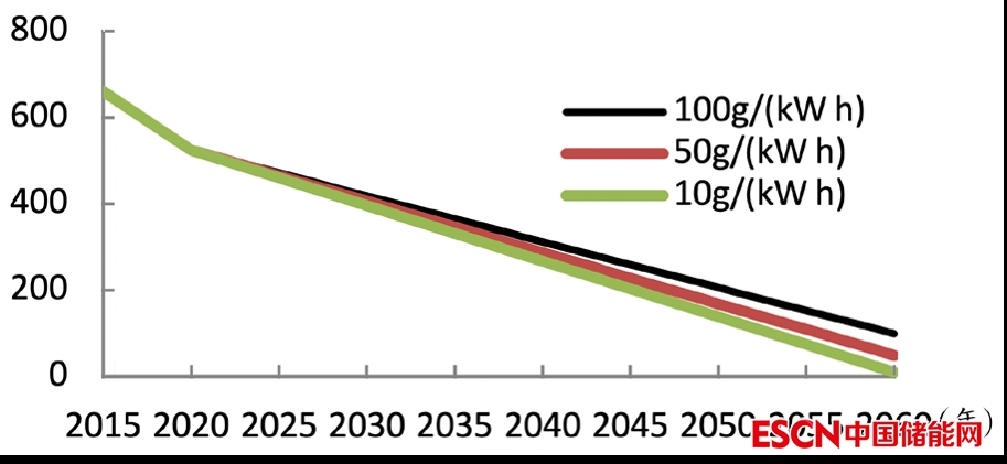 從 2020 年的 594 克/千瓦時碳排放現(xiàn)狀開始,到實現(xiàn) 2060 年 50 克/千瓦時的減排目標(biāo),意味著每 10年減少 130 多克,減排幅度也是很大的。不同排放標(biāo)準(zhǔn)下的減排預(yù)測見(圖 3)。