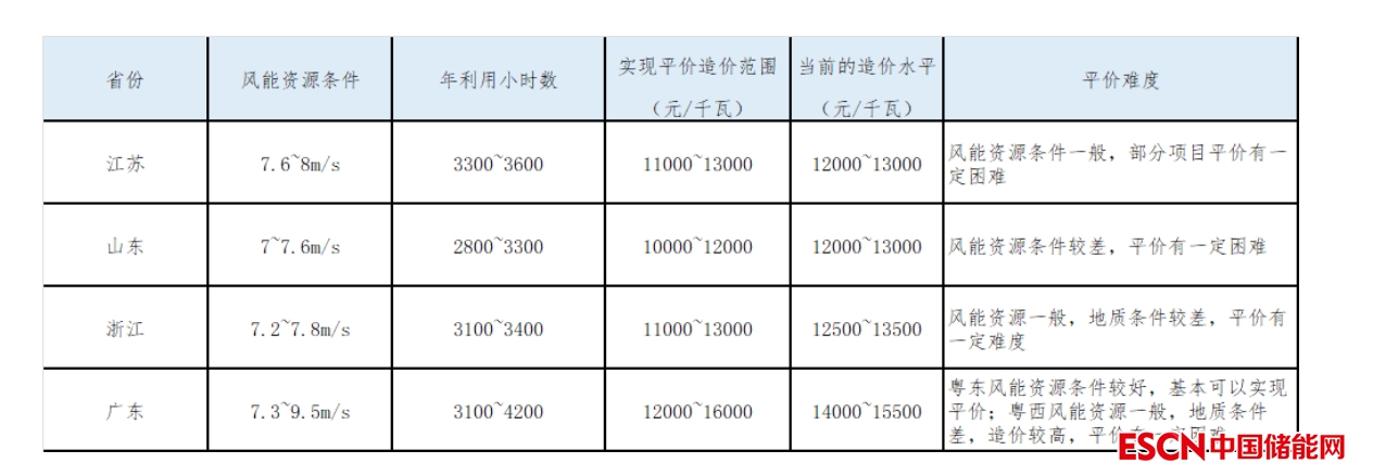 海上風(fēng)電主要省份在6%收益率條件下實(shí)現(xiàn)平價(jià)的造價(jià)水平