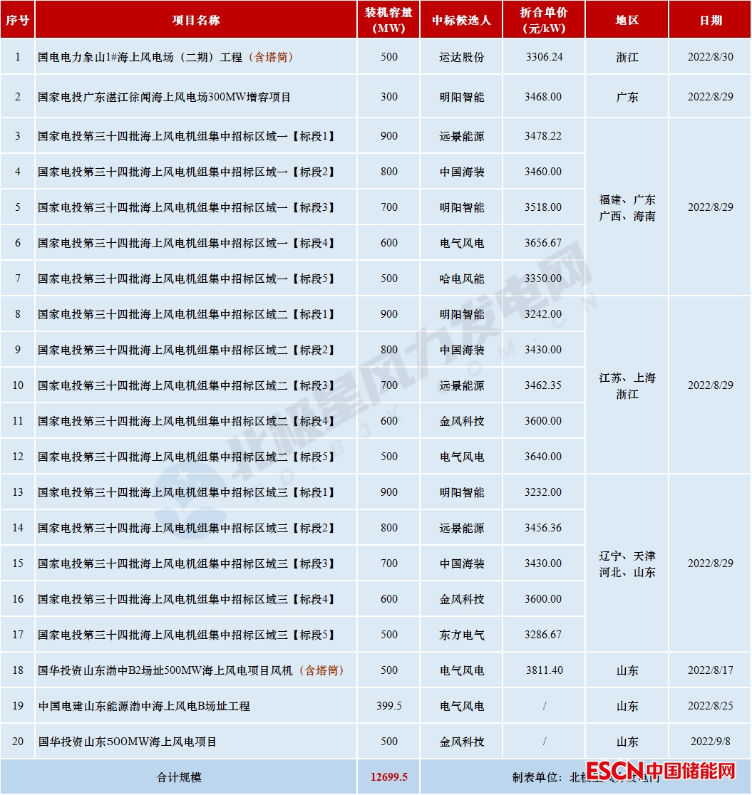 據(jù)北極星風(fēng)力發(fā)電網(wǎng)不完全統(tǒng)計(jì),2022年8月至發(fā)文日,共計(jì)20個(gè)海上風(fēng)電項(xiàng)目標(biāo)段中標(biāo)公示,總裝機(jī)12699.5MW。分別為:國(guó)電電力象山1#海上風(fēng)電場(chǎng)(二期)工程、廣東湛江徐聞海上風(fēng)電場(chǎng)300MW增容項(xiàng)目、國(guó)家電投2022年度第三十四批集中招標(biāo)(海上風(fēng)電競(jìng)配機(jī)組框架招標(biāo))、國(guó)華投資山東渤中B2場(chǎng)址500MW海上風(fēng)電項(xiàng)目、山東能源渤中海上風(fēng)電B場(chǎng)址工程、國(guó)華投資山東500MW海上風(fēng)電項(xiàng)目。