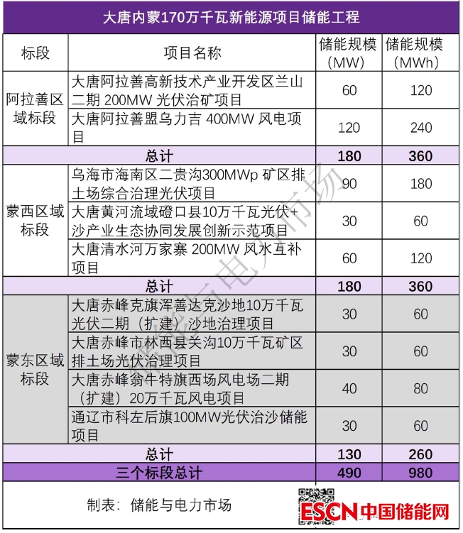 大唐內(nèi)蒙古分公司170萬(wàn)千瓦新能源項(xiàng)目?jī)?chǔ)能工程共包含9個(gè)新能源配儲(chǔ)項(xiàng)目,涉及儲(chǔ)能規(guī)模總計(jì)490MW/980MWh,分三個(gè)標(biāo)段進(jìn)行招標(biāo),此次公布的招標(biāo)結(jié)果為蒙東標(biāo)段,共包含4個(gè)新能源配儲(chǔ)項(xiàng)目。各標(biāo)段規(guī)模以及項(xiàng)目情況如下表。