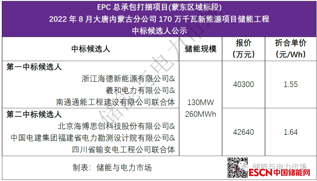 浙江海德新能源有限公司、羲和電力有限公司、南通通能工程建設(shè)有限公司組成的聯(lián)合體以總報(bào)價(jià)40300萬(wàn)元,折合單價(jià)1.55元/Wh,成為第一中標(biāo)候選人。中標(biāo)結(jié)果如下表。
