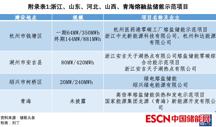 2022年,多個省份公布了計劃建設(shè)的新型儲能示范項目名單,其中,浙江省、山東省、河北省、山西省、青海省的名單中披露了項目的技術(shù)路線,《財經(jīng)十一人》根據(jù)儲能頭條的數(shù)據(jù)統(tǒng)計整理,5省范圍內(nèi)熔融鹽儲能示范項目如下: