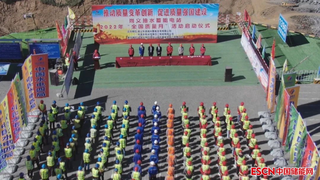 項目觀景臺上,條幅高掛,彩旗飄揚,尚義抽水蓄能電站正在舉行以“推動質(zhì)量變革創(chuàng)新 促進質(zhì)量強國建設(shè)”為主題的2022年“全國質(zhì)量月”活動啟動儀式。