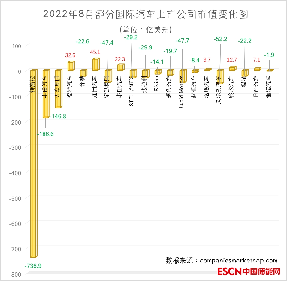 不過,福特汽車(F,股價14.74美元,市值592.6億美元)、通用汽車(GM,股價40.53美元,市值590.9億美元)等車企在8月實現(xiàn)了市值增長,其背后原因與美國相關(guān)部門在8月中旬簽署了《通脹削減法案》有關(guān)。根據(jù)《通脹削減法案》,在北美生產(chǎn)和組裝的新能源汽車可以獲得補(bǔ)貼,因而,通用汽車和福特汽車成為該法案的贏家。