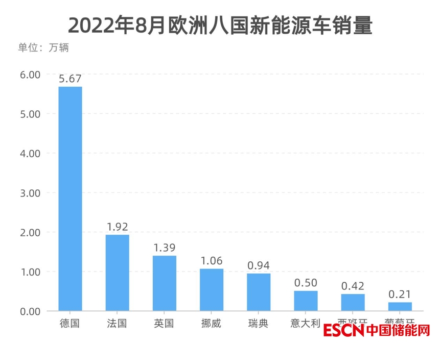 公開資料顯示,8月,德國、法國、挪威、英國、瑞典、意大利、西班牙、葡萄牙等八國純電動車銷量分別為5.67萬輛、1.92萬輛、1.06萬輛、1.92萬輛、0.94萬輛、0.50萬輛、0.42萬輛和0.21萬輛,合計銷量約為12.27萬輛,同比小幅增長1.5%,環(huán)比下滑1.2%。