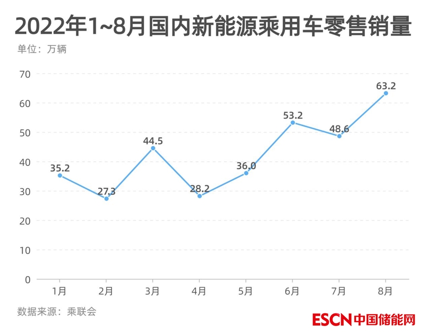 據(jù)乘聯(lián)會數(shù)據(jù),8月國內(nèi)新能源乘用車零售銷量為63.2萬輛,同比增長103.9%,環(huán)比增長12%,再創(chuàng)歷史新高;1~8月,國內(nèi)新能源乘用車?yán)塾嬃闶?26.2萬輛,同比增長119.7%,整體走勢持續(xù)向上。