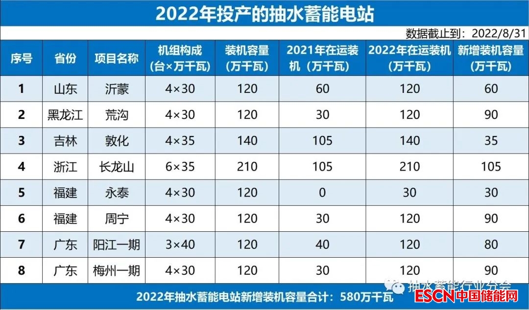 中國儲(chǔ)能網(wǎng)訊:2022年,我國抽水蓄能電站進(jìn)展順利。截至 2022 年 8 月底,我國抽水蓄能新增投產(chǎn) 580 萬千瓦,在運(yùn)裝機(jī)規(guī)模達(dá)到 4219 萬千瓦。新增投產(chǎn)項(xiàng)目情況詳見下表(根據(jù)公開資料整理):