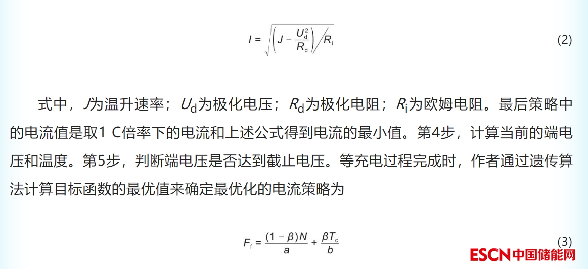 Ye等在2018年提出利用優(yōu)化問題的約束在整個充電過程中包括目標(biāo)SOC,利用溫升速率的上限確定充電過程中可接受的最大電流。根據(jù)實驗結(jié)果,在25 ℃下,基于等效電路/溫度模型的充電策略的充電時間和溫升相比傳統(tǒng)的CC-CV充電策略,可分別減少8.56%和67.3%,證明了基于該模型的方法可以優(yōu)化和改善充電性能。第1步,先計算電池當(dāng)前的SOC。第2步,通過等效電路模型,通過當(dāng)前已知的SOC計算出開路電壓,隨后內(nèi)阻、極化內(nèi)阻、極化電容和極化電壓都可以獲得。第3步,每個時刻的電流可以通過溫升速率、極化電壓、極化內(nèi)阻和歐姆電阻獲得: