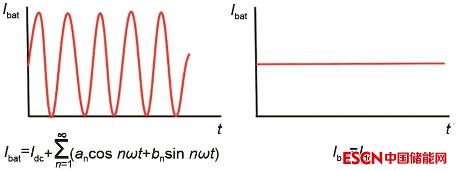 交流充電方法看似類似于脈沖電流充電策略,但是區(qū)別在于其周期的時間尺度并不在一個量級上。Chen等在2012年時提出了交流電充電方式,它是通過加載一個周期的正弦電流在原有的直流電流之上的方法,如圖7所示。這種方法根據(jù)交流阻抗譜確定最小交流阻抗的頻率,隨后用確定的優(yōu)化頻率加載到原有的直流電流進(jìn)行充電。實驗論證了交流電充電策略在充電速度、充電時間、充電效率和最高溫升方面相比傳統(tǒng)的CC-CV充電提高了17%、2%、45.8%和16.1%。同年,交流電充電策略被提出了質(zhì)疑。Cho等介紹了在交流電充電中考慮直流分量時的電池阻抗分析,通過使用二階RC電池模型和過電位電壓波形來分析實際電池阻抗。結(jié)果表明,在最小交流阻抗頻率下,實際電池阻抗并不是最小的。因此,交流電充電的充電時間、充電量和充電效率與傳統(tǒng)CC-CV充電策略的充電時間、充電量和充電效率沒有顯著差異。同時由于交流效應(yīng),交流電充電使電流和最大溫升分別惡化22.5%和18%。兩年后,在2017年Bessman等證明在方形鋰離子電池中并沒有發(fā)現(xiàn)交流電充電策略有任何幫助。