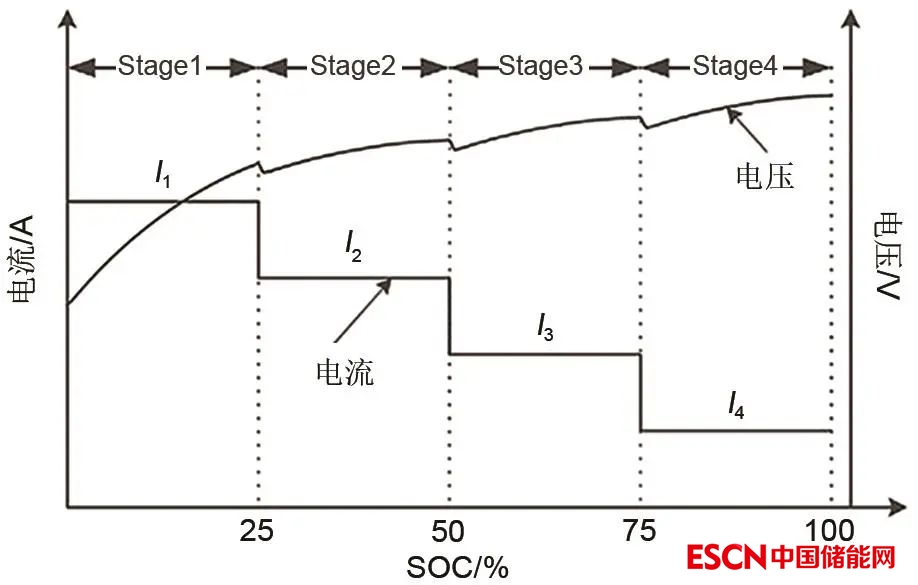 臺階充電策略是早期一些研究者們專門設(shè)計的快速充電策略,該充電方法被認(rèn)為是高質(zhì)量的充電模式,具有循環(huán)壽命長、充放電能量效率高、充電時間短的優(yōu)點,是替代傳統(tǒng)CC-CV充電的一類方法。為了減少充電時間,充電時一定需要比傳統(tǒng)CC段更大的電流,然而僅僅只在CC階段采用大電流會導(dǎo)致端電壓快速達(dá)到截止電壓上限,而在短時間內(nèi)未能獲得預(yù)期充電容量。此時充電過程切換到CV階段,在CV階段則需要更多的充電時間。所以從整個充電階段來看,充電時間未必會減少。這個問題可以通過臺階充電策略(多級CC充電)來解決。具體實施方案是先以第一個預(yù)設(shè)電流給電池充電,到電池達(dá)到截止條件的限制時,充電過程轉(zhuǎn)移到下一個預(yù)設(shè)電流并重復(fù)之前的充電過程直到使用完所有預(yù)設(shè)的充電電流。