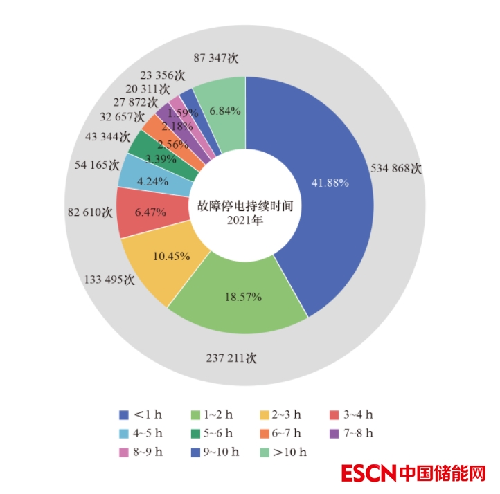 2021年,用戶故障停電平均持續(xù)時間為3.63 h/次,同比增加0.04 h/次。其中,城市地區(qū)用戶故障停電平均持續(xù)時間為3.43 h/次,同比增加0.17 h/次;農(nóng)村地區(qū)用戶故障停電平均持續(xù)時間為3.71 h/次,同比增加0.03 h/次。其中,41.88%的故障停電能夠在1 h以內(nèi)排除并恢復(fù)供電;18.57%的故障停電能夠在2 h以內(nèi)排除并恢復(fù)供電;6.84%的故障停電恢復(fù)時間超過了10 h。2021年故障停電持續(xù)時間分布情況見圖17。
