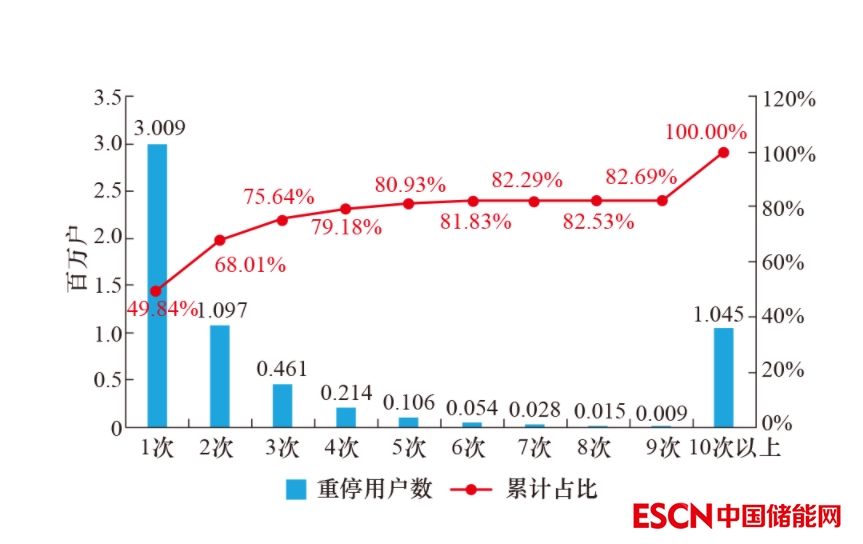 2021年,全國有48.47%的用戶未發(fā)生預(yù)安排停電。在發(fā)生預(yù)安排停電用戶中,有近49.84%的用戶預(yù)安排停電1次;19.07%的用戶預(yù)安排停電次數(shù)在5次以上,17.31%的用戶預(yù)安排停電次數(shù)在10次及以上。2021年用戶預(yù)安排停電次數(shù)分布情況見圖14。