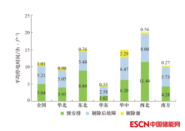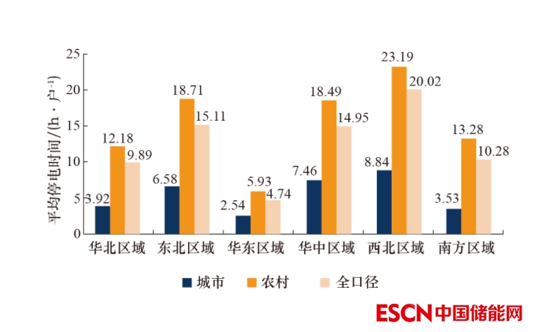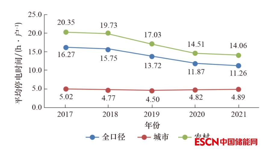 2021 年,全國供電系統(tǒng)用戶平均供電可靠率99.872%,同比上升0.007個百分點;用戶平均停電時間11.26 h/戶,同比減少0.61 h/戶;用戶平均停電頻率 2.77次/戶,同比增加0.08次/戶。其中,全國城市地區(qū)平均供電可靠率99.944%,農(nóng)村地區(qū)平均供電可靠率 99.840%,城市、農(nóng)村地區(qū)平均供電可靠率相差0.104個百分點;全國城市地區(qū)用戶平均停電時間4.89 h/戶,農(nóng)村地區(qū)用戶平均停電時間14.06 h/戶,城市、農(nóng)村地區(qū)用戶平均停電時間相差9.17 h/戶;全國城市地區(qū)用戶平均停電頻率1.24次/戶,農(nóng)村地區(qū)用戶平均停電頻率3.45次/戶,城市、農(nóng)村地區(qū)用戶平均停電頻率相差 2.21次/戶。