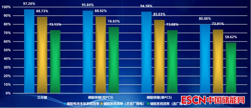 中國儲能網(wǎng)訊:大慶基地儲能產品實證板塊涵蓋6個廠家7種不同儲能技術類型,包括電化學儲能、電磁儲能、機械儲能三大類技術, 涵蓋磷酸鐵鋰、三元鋰、鈦酸鋰、全釩液流、超級電容、混合電容、飛輪儲能。從系統(tǒng)效率來看,儲能電池本體系統(tǒng)效率較高,可達到承諾值。儲能系統(tǒng)增加PCS、功率轉換器件損耗后,特別是空調或泵自耗電后,系統(tǒng)效率偏低。