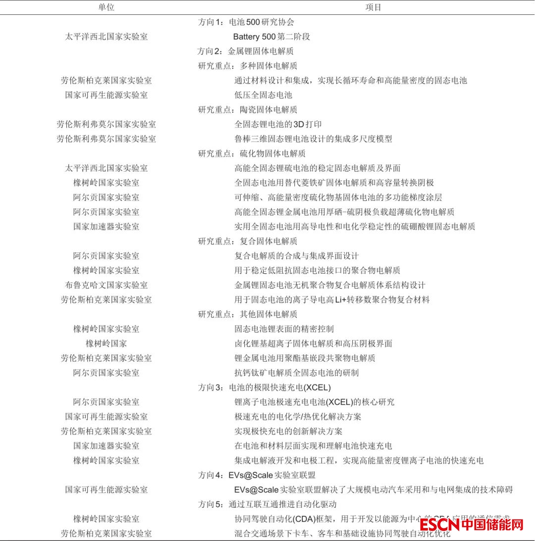 能源部認為先進的鋰電池在21世紀的技術中起著不可或缺的作用,如電動汽車、固定電網存儲在國防中的應用,這些技術對確保美國清潔能源的未來至關重要。2021年10月美國能源部計劃提供2.09億美元資金,宣布支持阿貢國家實驗室等開展全固態(tài)電池、電池快充技術等領域26個項目研發(fā)。此次研究項目的關鍵目標是顯著降低下一代電池技術的成本和尺寸,推進電池在15分鐘內極速充電,以減輕全國范圍內充電的數(shù)千萬輛汽車對電網的潛在影響等。研究項目包括電池500第二階段、通過材料設計和集成實現(xiàn)長循環(huán)壽命和高能量密度的固態(tài)電池、低壓全固態(tài)電池、全固態(tài)鋰電池的3D打印、高能全固態(tài)鋰硫電池的穩(wěn)定固態(tài)電解質及界面、鋰離子電池極速充電電池等,其中重點研究固態(tài)電解質技術包括多種固體電解質、陶瓷固體電解質、復合固體電解質等,承擔項目牽頭單位包括8家國家實驗室,其中橡樹嶺國家實驗室6項,勞倫斯柏克萊國家實驗室和阿爾貢國家實驗室各5項,國家可再生能源實驗室3項,勞倫斯利弗莫爾國家實驗室、太平洋西北國家實驗室和國家加速器實驗室各2項,布魯克哈文國家實驗室1項,具體研究項目如表1所示。
