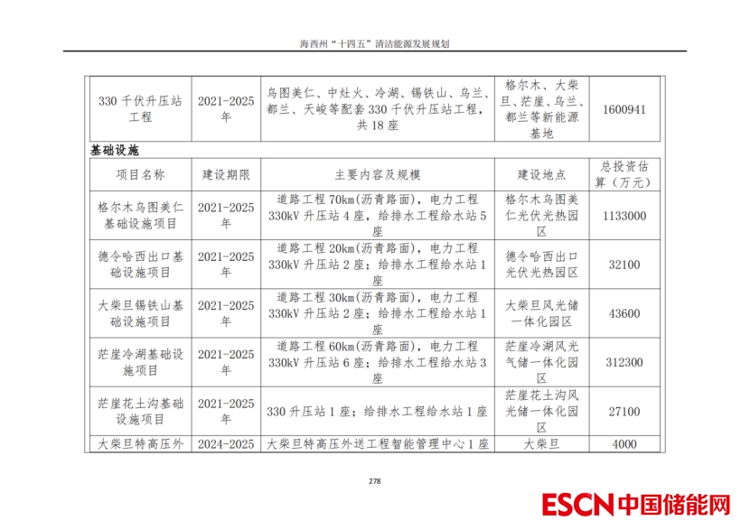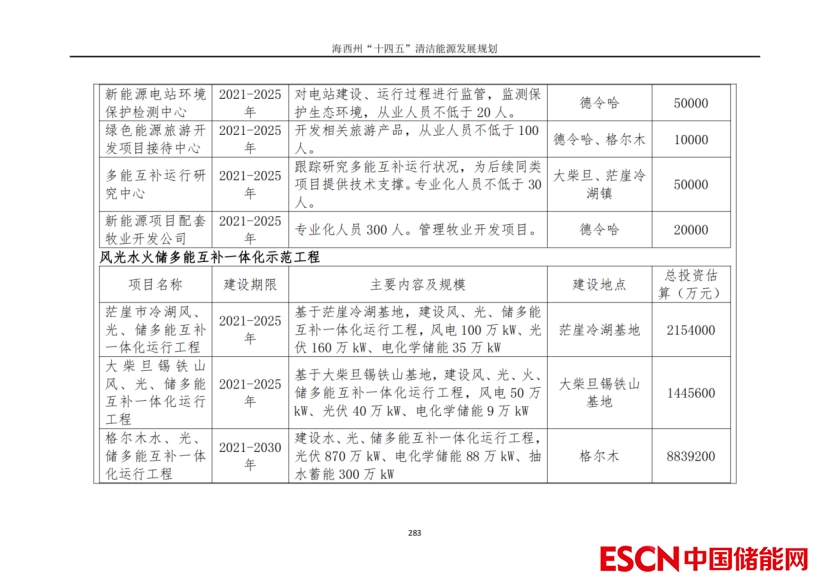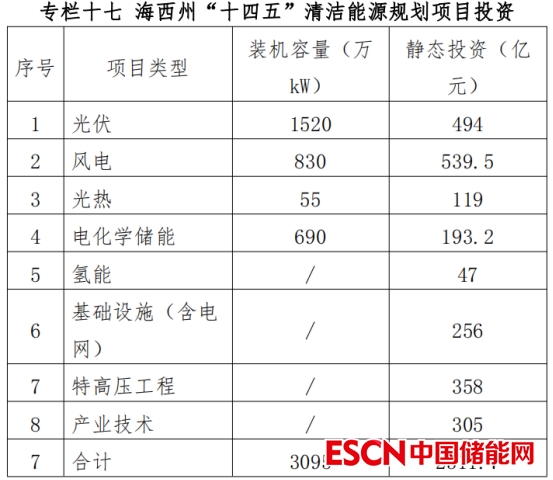 投資情況方面,海西州“十四五”規(guī)劃推薦方案光伏新增1520萬千瓦,投資需求約494億元;風(fēng)電新增830萬千瓦,投資需求約539.5.5億元,光熱55萬千瓦,投資需求約119億元;新能源發(fā)電配套電化學(xué)儲能投資約193.2億元;基礎(chǔ)設(shè)施投資約256億元;特高壓外送通道工程投資約358億元;清潔能源配套產(chǎn)業(yè)和技術(shù)研究投資約305億元?!笆奈濉币?guī)劃新增各類項目總投資合計約2311.7億元。
