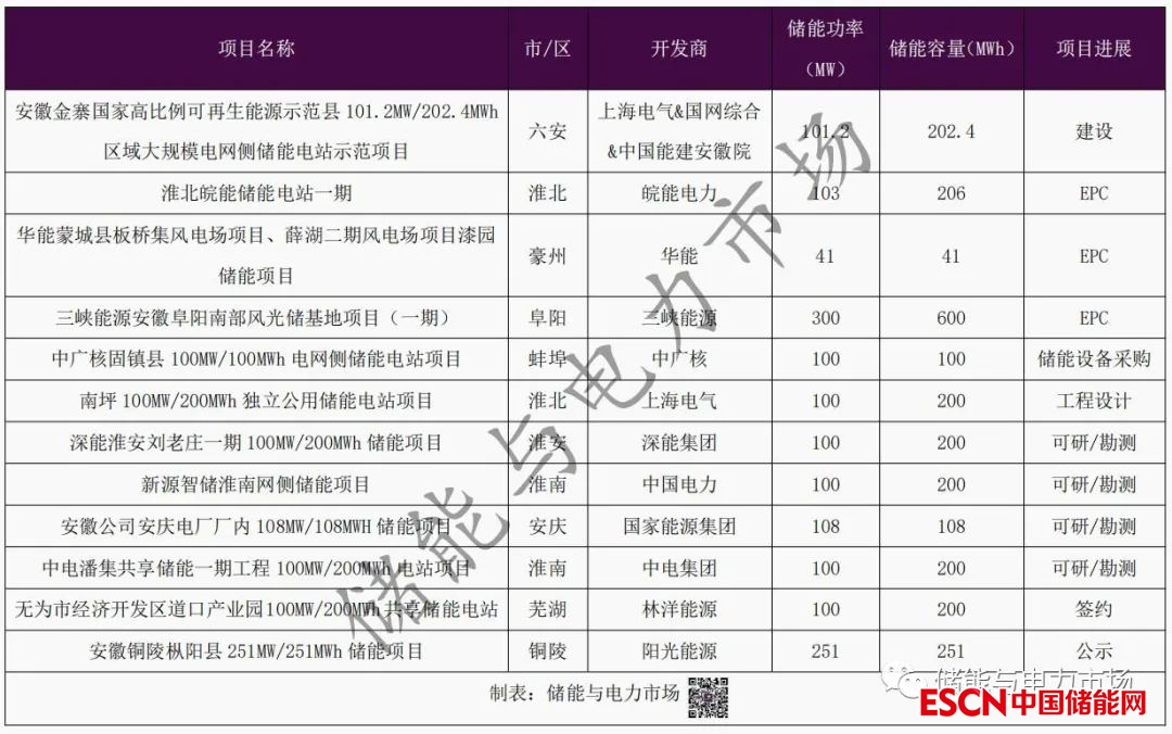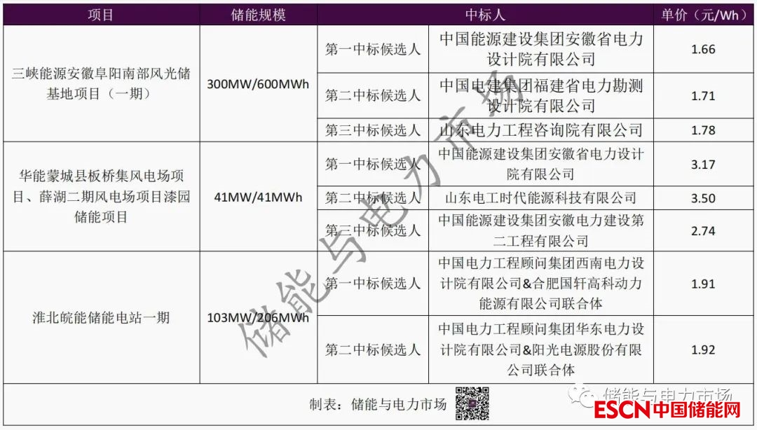 表 安徽已完成EPC招標(biāo)的儲能項目和價格情況