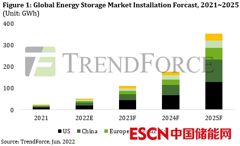 從目前各國儲能市場的增速來看,中國即將趕超歐美,主要增長動力來自發(fā)電系統(tǒng)。TrendForce認為,中國新能源儲能將朝著規(guī)模化、市場化方向發(fā)展,形成以發(fā)電為主、政策驅動、儲能強制、電網側(輸配電)、消費側為補充的儲能格局。到2025年,中國儲能市場有望突破100GWh。