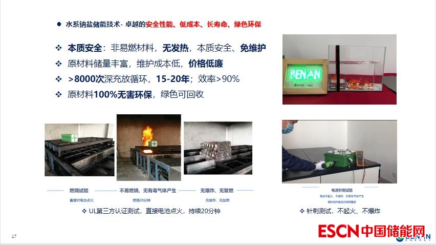 講一下我們公司的產(chǎn)品。它的幾個(gè)特點(diǎn),一個(gè)是本質(zhì)安全,是和鋰電池的風(fēng)險(xiǎn)相對來講的。從兩個(gè)方面來講它的本質(zhì)安全,鋰電池的正極材料的熱分解溫度最高能到400度,這樣我們用的材料,就剛才所說的磷酸鹽,或者是聚陰離子化合物,這些材料都是經(jīng)過高溫合成,最高溫度耐受性會(huì)達(dá)到1000度,所以這個(gè)材料從材料本身,不會(huì)在循環(huán)過程中產(chǎn)生一些熱分解的反應(yīng)。還有一個(gè)是電解液,電解液就是無機(jī)鹽的水溶液,由于水的高比熱容,不可能產(chǎn)生巨大的副反應(yīng)。再加上電池所用的外殼都是阻燃的,完全沒有問題。更苛刻的實(shí)驗(yàn)是直接外部火焰的燃燒,我們把電池放在測試架上,外面就澆上汽油,點(diǎn)燃汽油,汽油燃燒了20分鐘,20分鐘之后汽油燃燒沒有了,這個(gè)電池都不會(huì)發(fā)生任何反應(yīng)。放在那邊,它沒有爆炸,也無復(fù)燃情況發(fā)生。所以從電化學(xué)反應(yīng)的機(jī)理上和材料本身上,可以證明本質(zhì)安全。