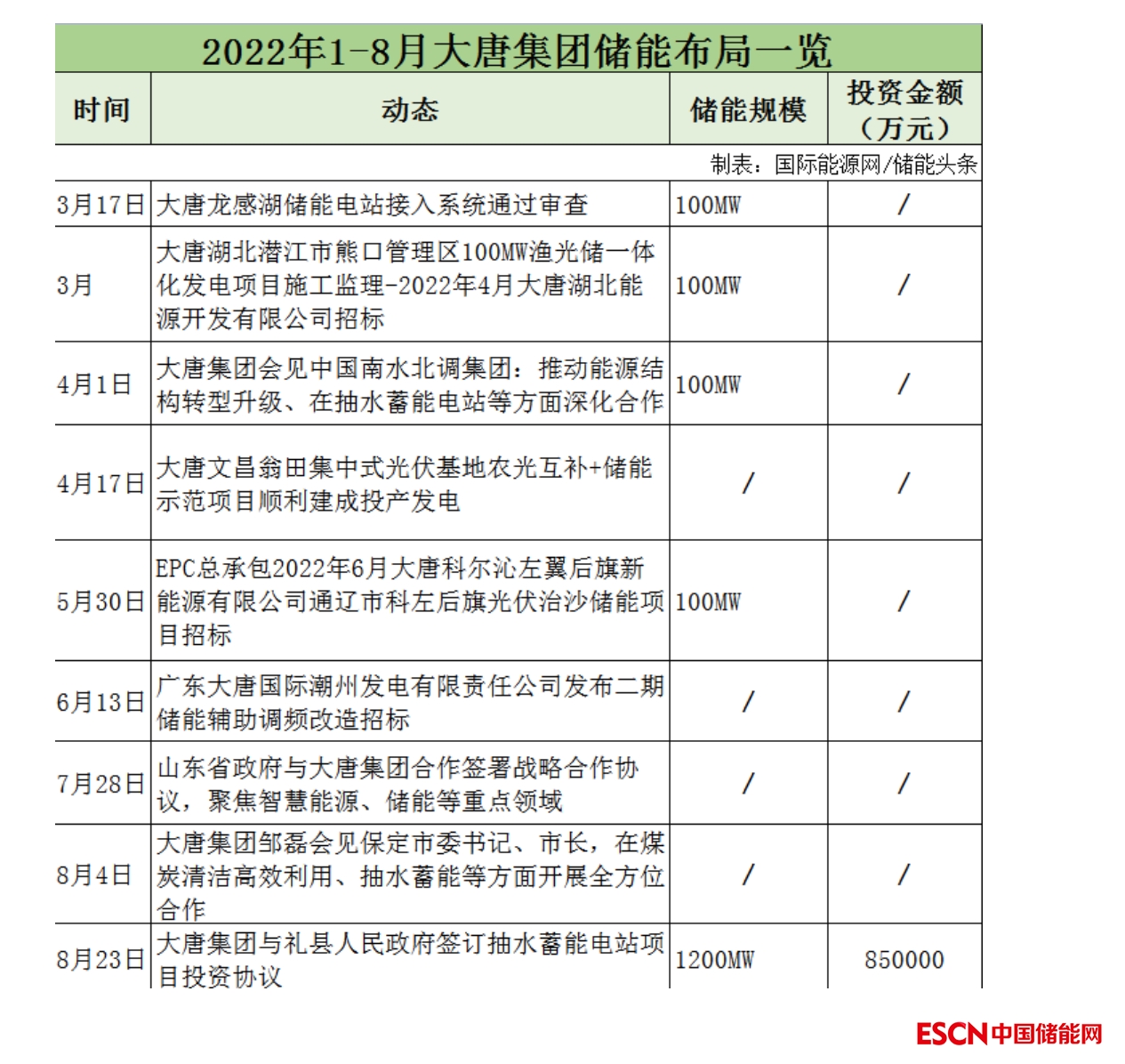 據(jù)不完全統(tǒng)計(jì),2022年1-8月,大唐集團(tuán)儲(chǔ)能項(xiàng)目招標(biāo)3個(gè),與山東、保定、南水北調(diào)集團(tuán)等簽訂合作協(xié)議,涉及抽水蓄能、智慧能源等領(lǐng)域。