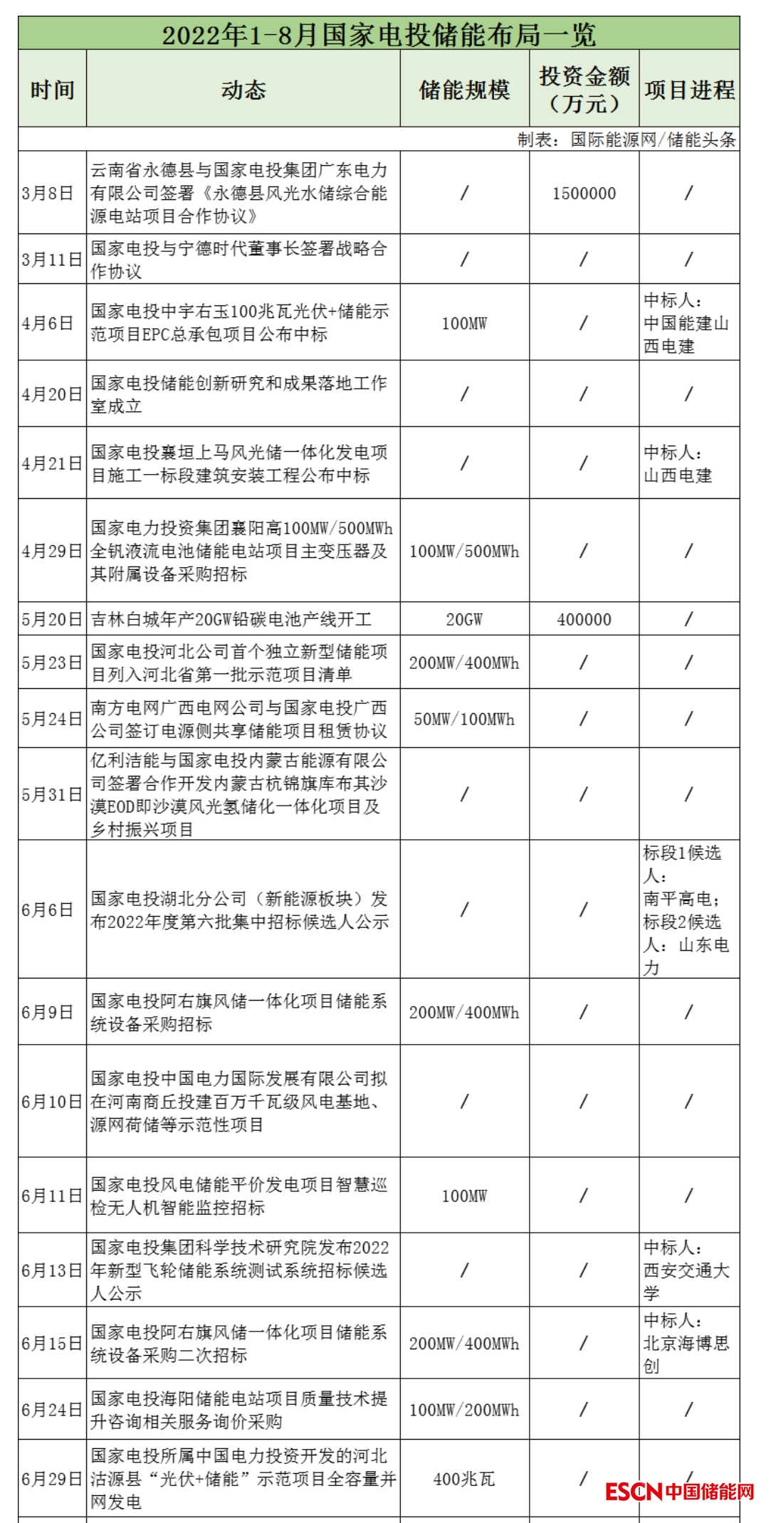 據(jù)不完全統(tǒng)計(jì),2022年1-8月,國(guó)家電投與寧德時(shí)代、中國(guó)電建、中國(guó)天楹等簽訂合作協(xié)議,圍繞儲(chǔ)能材料、風(fēng)光氫儲(chǔ)、重力儲(chǔ)能等方面進(jìn)行合作。儲(chǔ)能項(xiàng)目招標(biāo)26個(gè),涉及飛輪儲(chǔ)能、液流電池、鉛炭電池、抽水蓄能及智慧新能源等方面。