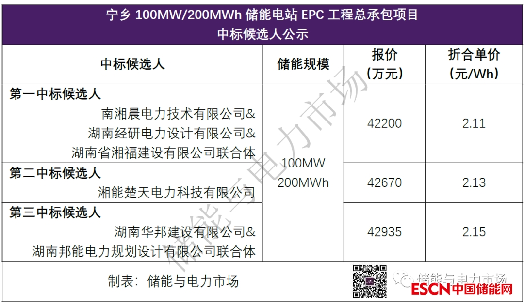 中國儲能網(wǎng)訊:近日寧鄉(xiāng)100MW/200MWh儲能電站EPC工程總承包項目發(fā)布中標候選人公示。湖南湘晨電力技術有限公司&湖南經(jīng)研電力設計有限公司&湖南省湘福建設有限公司聯(lián)合體以總報價42200萬元,折合單價2.11元/Wh,成為第一中標候選人。中標候選人信息如下。