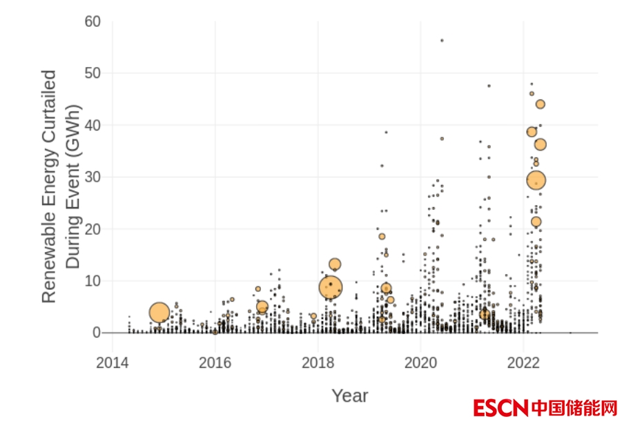 圖1繪制了2014年到2022年的可再生能源棄電的數(shù)據(jù),并顯示了每個(gè)事件期間的棄電量。每個(gè)氣泡的大小代表削減事件的持續(xù)時(shí)間。