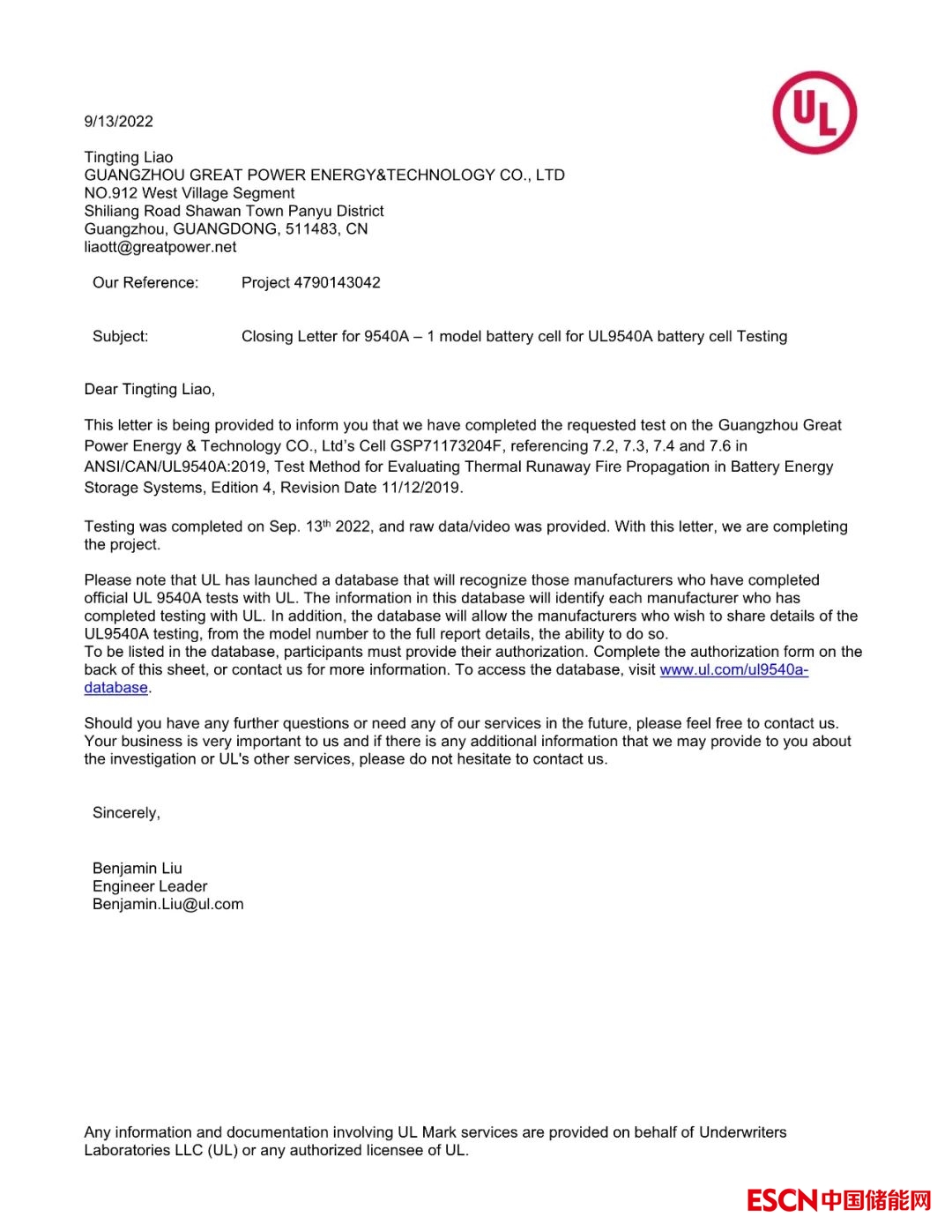 中國儲能網(wǎng)訊:近日,鵬輝能源儲能電芯GSP71173204F-280Ah獲得 UL9540A認證,這是繼2021年公司的GSP34135214-100AH電芯獲得該認證后,再次成功獲得“該項”國際認證,標志著公司研發(fā)與生產(chǎn)的電芯產(chǎn)品獲得全球儲能電池領先標準的認可,具有高安全等級,這將助力鵬輝能源更好地開拓國際儲能市場。