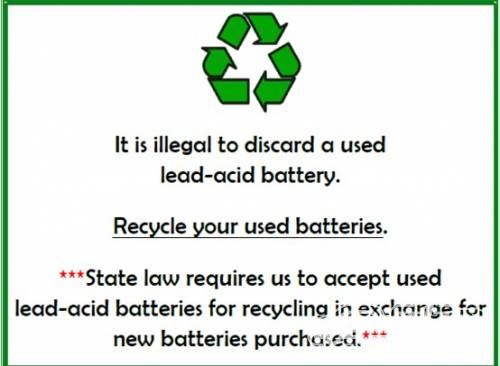 (標(biāo)志內(nèi)容:隨意丟棄廢舊鉛酸電池是違法行為,應(yīng)對(duì)鉛酸電池進(jìn)行回收。州法律規(guī)定,消費(fèi)者購(gòu)買新鉛酸電池時(shí),須用舊電池交換,電池零售商負(fù)責(zé)回收舊電池)