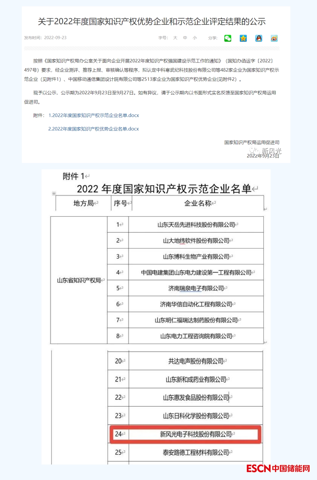 中國儲能網(wǎng)訊:9月23日,國家知識產(chǎn)權(quán)局公示了2022年度國家知識產(chǎn)權(quán)優(yōu)勢企業(yè)和示范企業(yè)的評定結(jié)果,新風(fēng)光電子科技股份有限公司憑借在知識產(chǎn)權(quán)創(chuàng)造方面的優(yōu)勢,成功入選為“國家知識產(chǎn)權(quán)示范企業(yè)”。