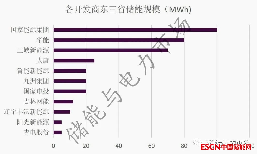 從開發(fā)商角度來看,國家能源集團位居榜首,共有3個項目,儲能容量共計100MWh,華能、三峽新能源分別以80MWh、70MWh的儲能容量緊隨其后。
